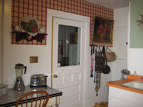 I'll also add wallpaper along the top of the pantry doors in the photo, above, but that's for another day. It took me around 3 hours just to paper this small wall and I'm wilting. (Not as young as I used to be, and all that.) I highly recommend plaid wallpaper, though, especially if you are a beginner because oh! All those straight lines to cut along--so easy!